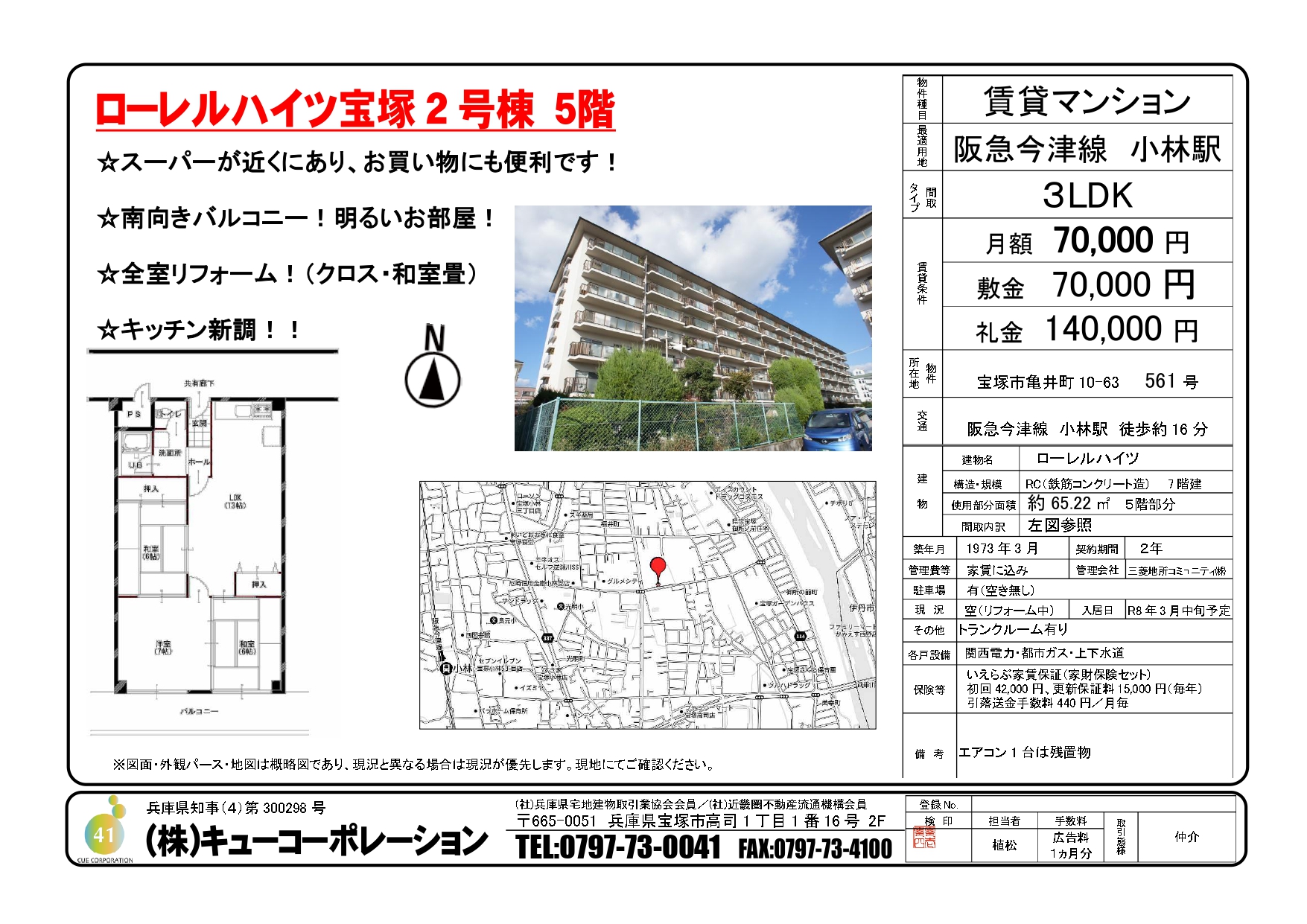 | 建物 | 建物名 ローレルハイツ宝塚 構造・規模 RC( 鉄筋コンクリート造) 7階建 使用部分面積 65.22㎡ 5階部分 築年月 1973年3月 |